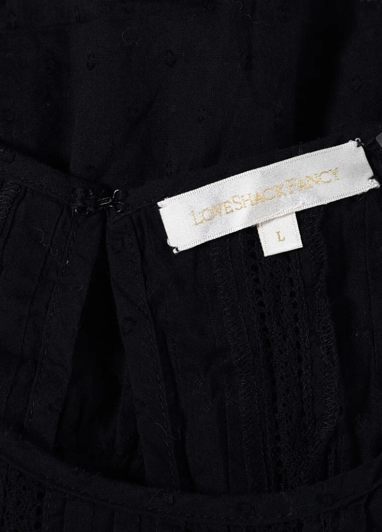 A romantic black mini crafted in airy cotton with delicate Swiss dots, soft ruffles, and signature LoveShackFancy femininity.